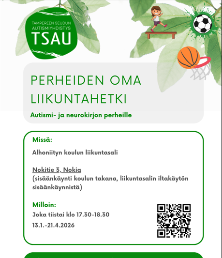 Liikuntahetki koko perheelle tiistaisin klo 17.30-18.30 Alhoniityn koulun salissa Nokialla. Tunnilla liikutaan yksin tai yhdessä - oman mielenkiinnon mukaan. Tunnilla on mahdollisuus osallistua…