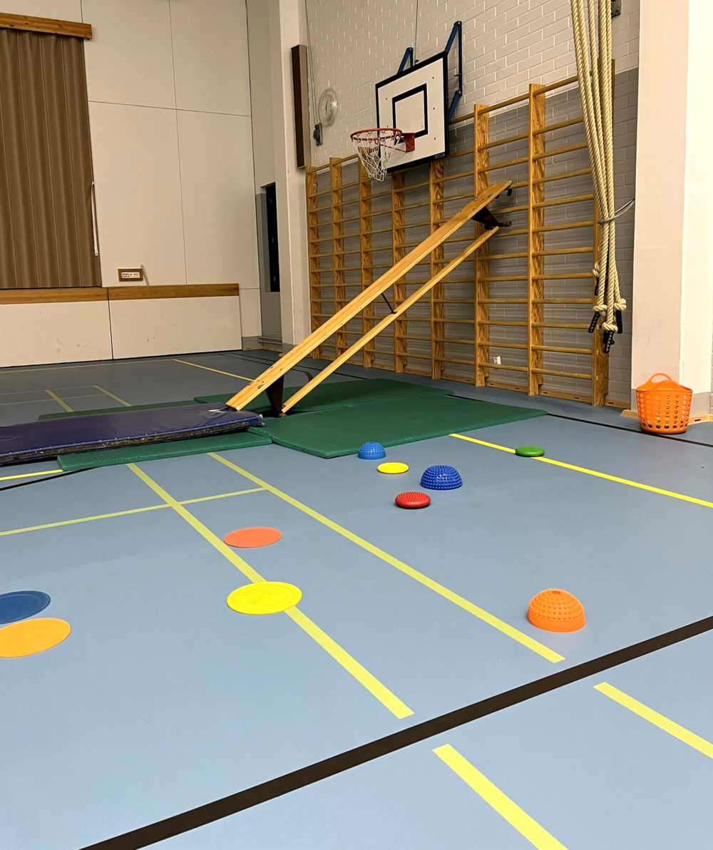 Koulun sali ja välineet ovat käytössämme tunnin ajan. Salin välineistä löytyy mm. puolapuut, renkaat, patjoja, koripallot ja korit, pehmopalloja, sählyvälineet, huiveja, sulkapallovälineet ja hyppynaruja.