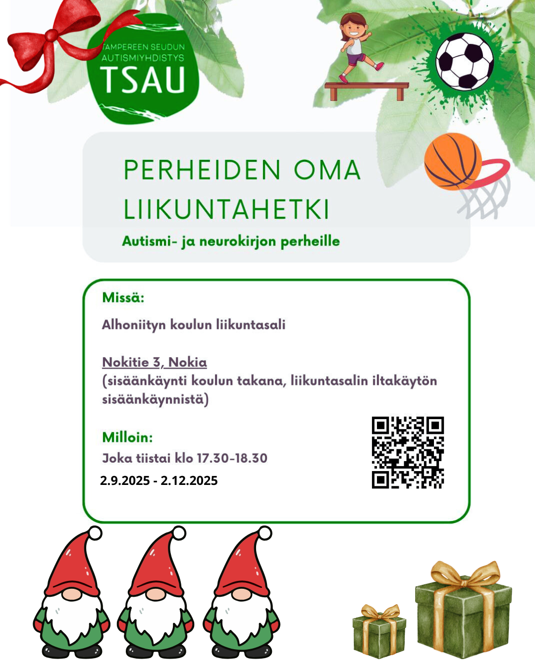 Tämä liikuntahetki on osa Nokian kaupungin Perhe Liik-Kiss kokonaisuutta ja kävijöille maksuton.