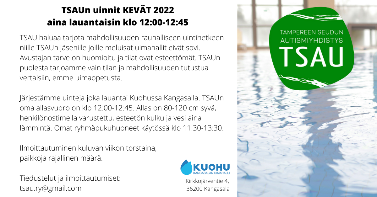 TSAUn oma uintivuoro joka lauantai Kangasalan uimahalli Kuohussa. Allas on varattu yksityiskäyttöön klo 12-12.45. Pienet erityispukuhuoneet ovat käytössä 11.30-13.30. Lisätietoja ja ilmoittautuminen tsau.ry@gmail.com