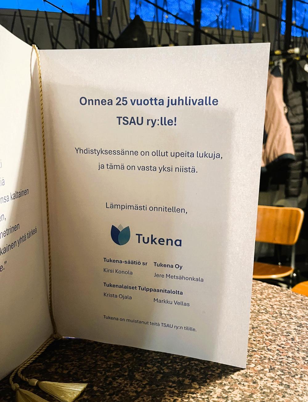 Lämpimät onnittelut juhlivalle TSAU ry:lle! Tukena-konsernilla on suuri ilo olla mukana juhlassa ja ennen kaikkea yhteistyöstä kehittäjäkumppanuudessa.